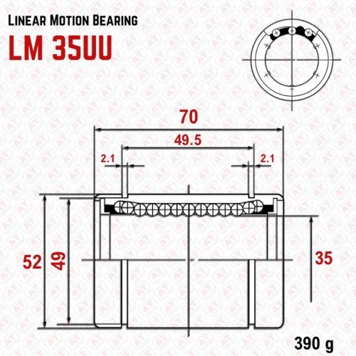 LM 35UU, LM-LML Series, Compact Ball Bushings, Linear Motion Bearings. Made in China. Unit weight 0.39kg. Dimensions: 35x52x70x0x0. Standard packing: single piece in a pack.